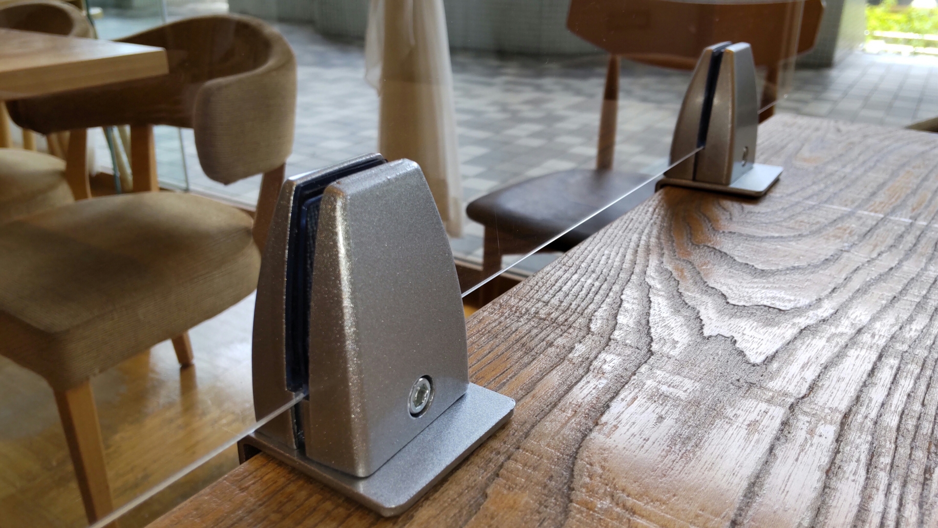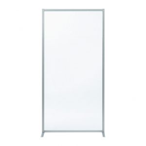 左右にあるフレームが太めのスチール製で、安定感抜群の対面用透明アクリルパーティション。