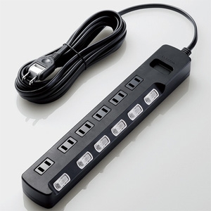 接続している機器を一度にON・OFFできる一括集中スイッチ付きで、トラッキング火災予防絶縁キャップ付きのL型プラグを採用しています。