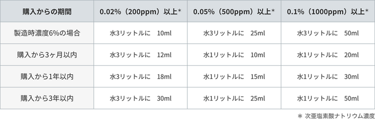 そのため花王プロフェッショナル・サービス公式サイトによると、病院用ハイターの希釈液を作るためには、以下の目安で希釈することをおすすめされています。