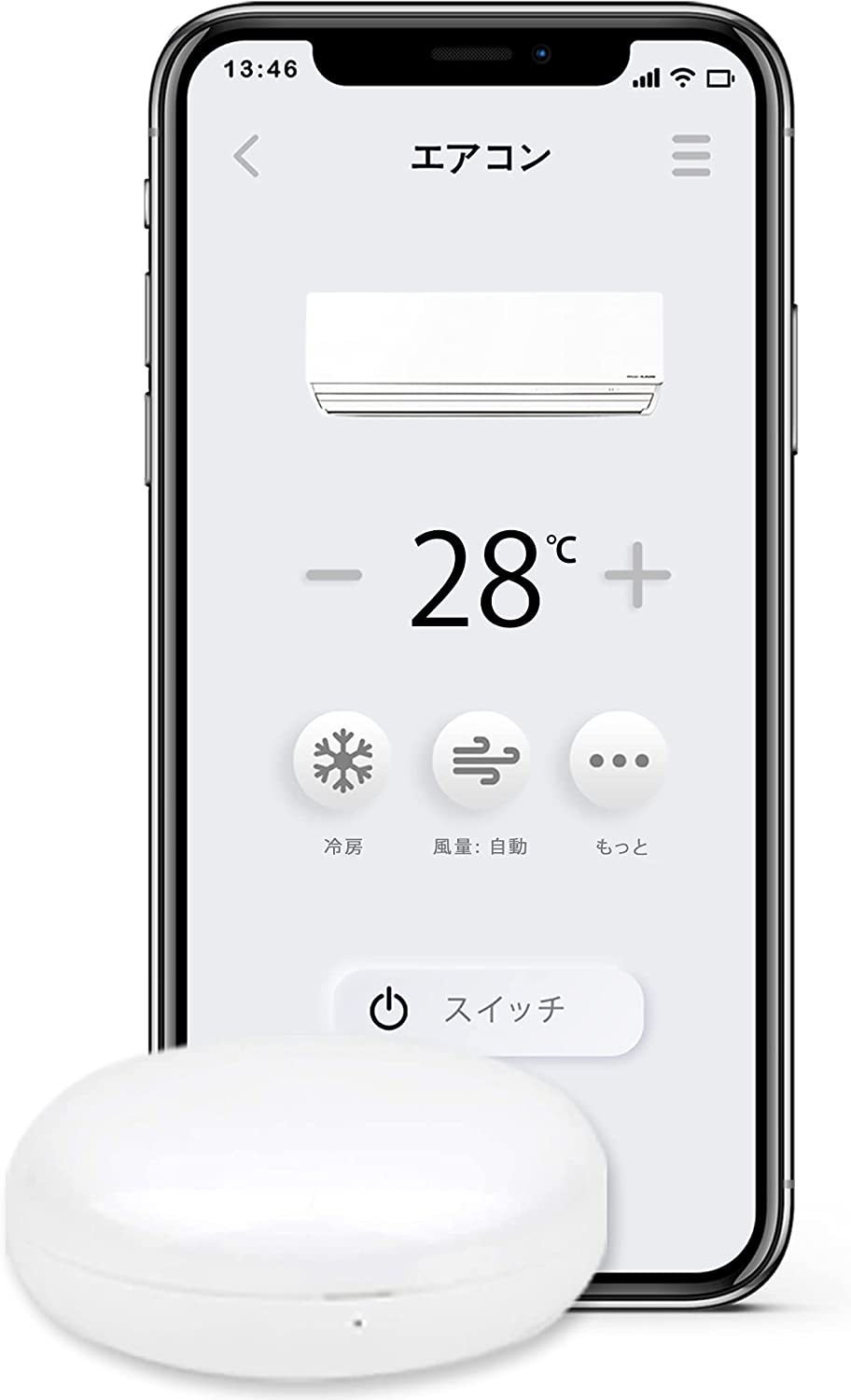 リーズナブルな価格帯ながらエアコン、テレビ、照明など、赤外線リモコンで操作する家電に対応し、本商品を連携することでいつでもどこでもスマホアプリから家電を操作できるようになります。